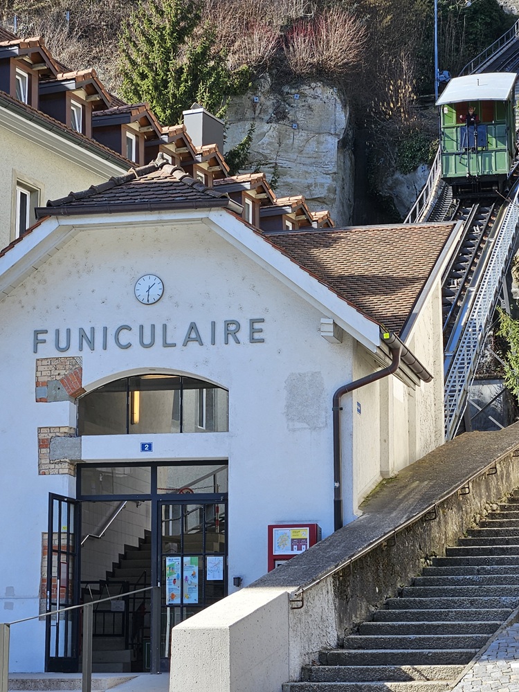 Dans le ‘Funi’ nostalgique tout en bois, qui constitue le lien entre la basse-ville et le Bourg, la vieille ville sur la falaise, nous sommes les seuls passagers cet après-midi ensoleillé début mars. Le funiculaire a été inauguré en 1899, et il a une particularité : son fonctionnement, car il marche avec des eaux usées comme carburant. Est-ce qu’on sent cela comme passager ? Je ne sens rien, Bernard cependant trouve le contraire.